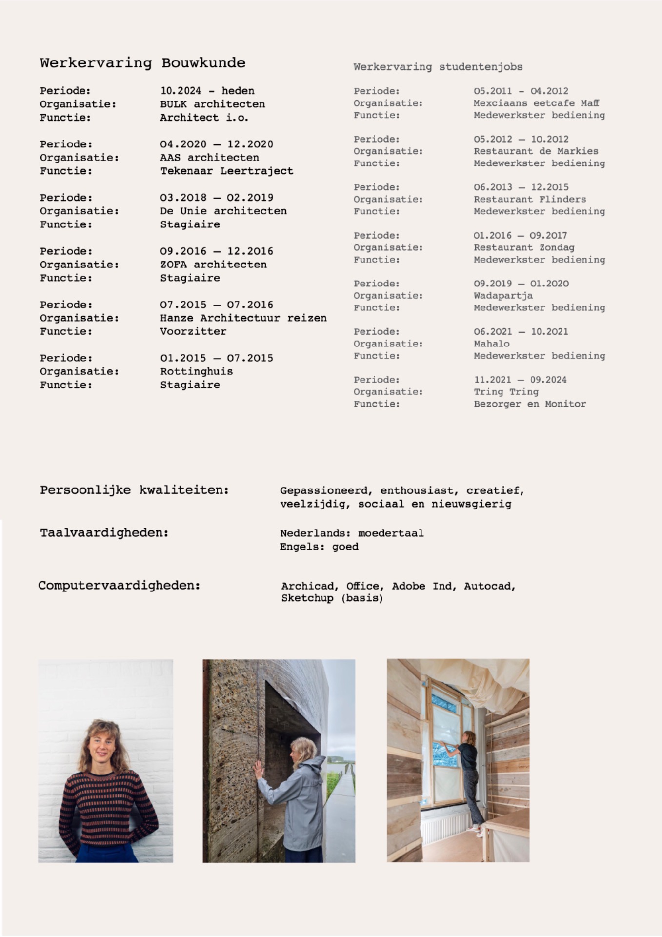 Ik ben gepassioneerd, enthousiast, creatief, veelzijdig, sociaal en nieuwsgierig. Naast mijn passie voor architectuur breng ik veel tijd door in de natuur, op een surfplank, aan de klimmuur, in de yogaschool of genietend van een voorstelling in het theater.